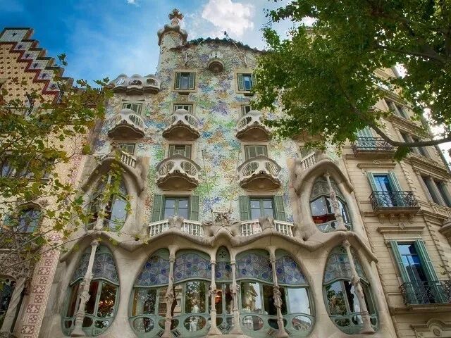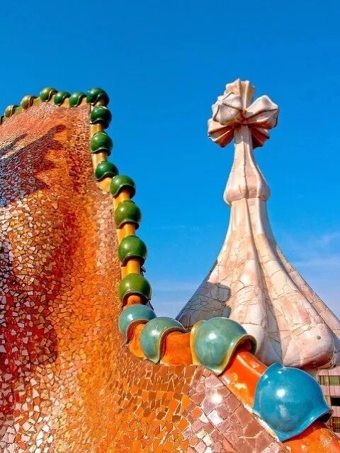 是高迪最好的梦幻作品。外墙点缀着蓝色、紫红色和绿色的瓷砖,镶嵌着波浪形的窗户框和阳台,凸凹不平的蓝色屋顶上有一座装饰奇特的烟囱。